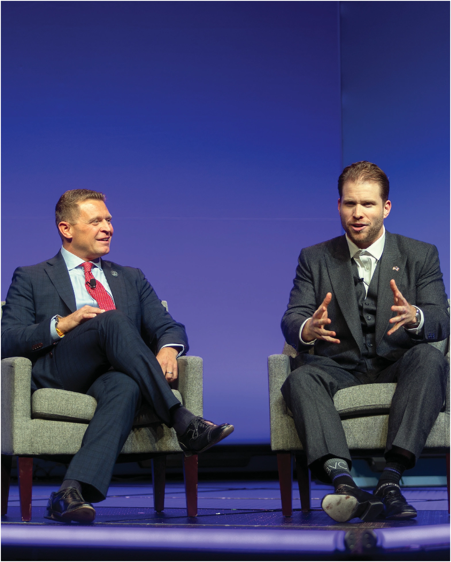 CROSS FIRE. 8VC founder Joe Lonsdale (right) regaled Iowa State Senator Michael Bousselot. Photography by Sarah Urich / ZTS Photo.